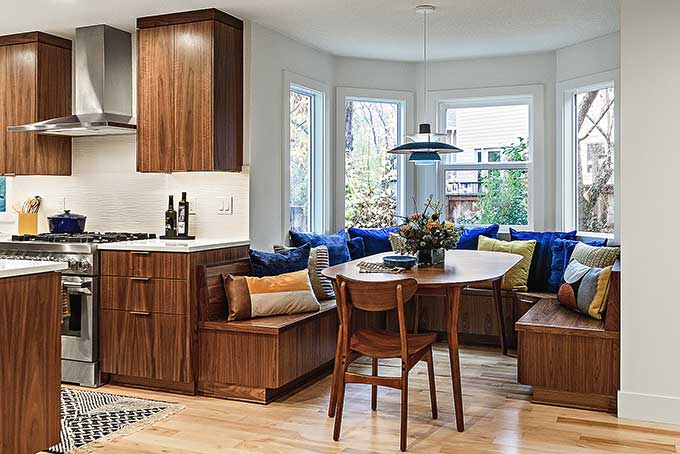 If you think your kitchen could make better use of the space, work with the Mountainwood team to develop a design plan that maximizes every inch of your existing space. Create a place for everything with custom cabinetry and enjoy cooking again with brand new appliances. Quartz countertops with coordinating backsplash tile provide easy maintenance and a fresh look. If you have a nook area, it’s common to create built-in banquet seating to make the space more purposeful. In the bathroom, it’s all about the walk-in shower – which transforms your space into a spa retreat.