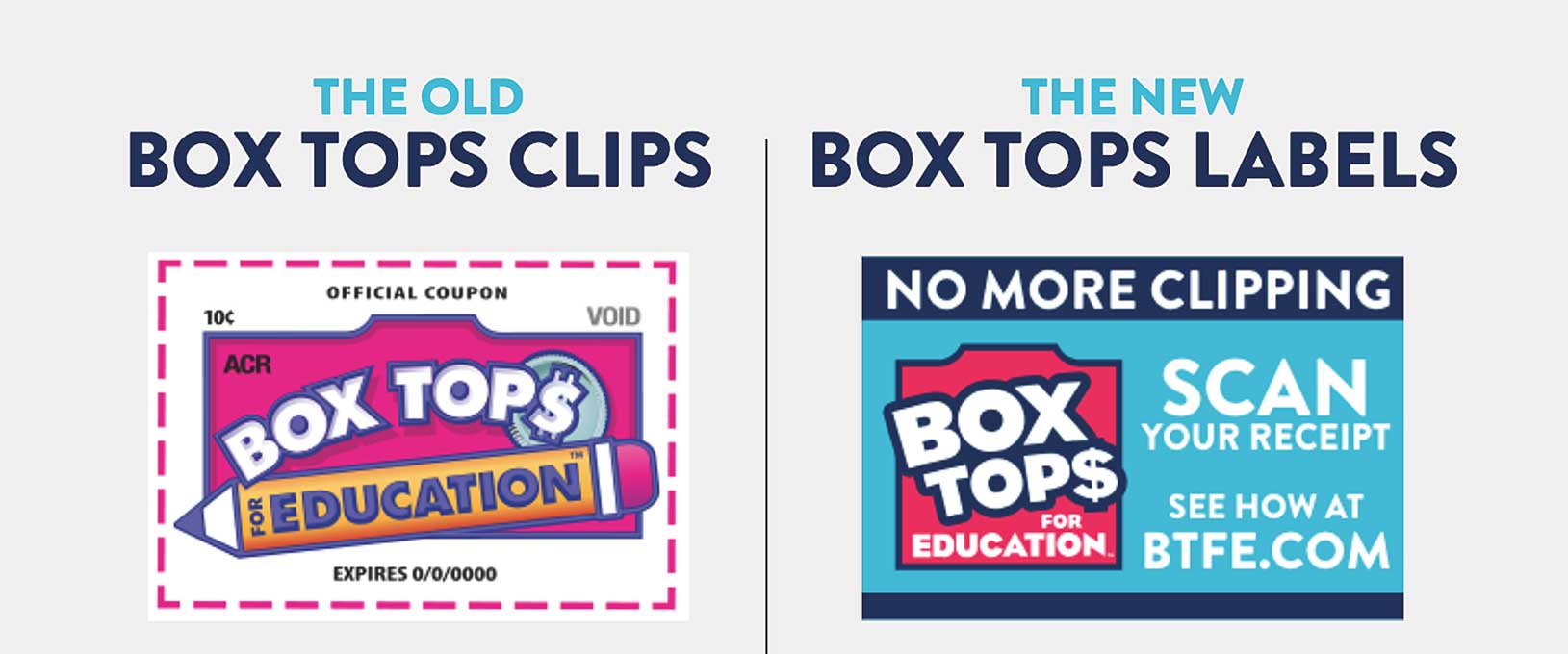 If you still have traditional Box Tops clips at home, make sure to send them to school. We will still earn cash for all clipped Box Tops until they expire. Better yet, you can “double dip” during the packaging transition by clipping traditional Box Tops AND scanning your store receipt containing products.