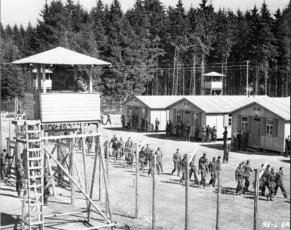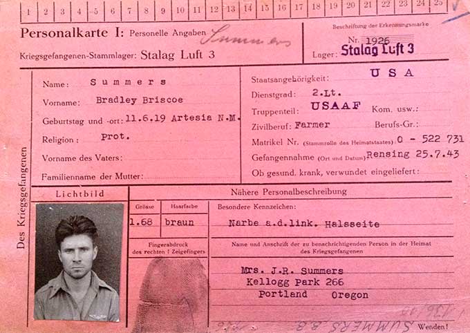 Bradley was sent to an interrogation center called Dulag Luft in Frankfurt. He was surprised to find that the ever efficient German military already a folder with his name on it and notes including his home address and military training. He limited his answers to Geneva Convention requirements. Because not cooperative, he was ordered to solitary confinement. But after that was not interrogated again. He was given script which enabled him to buy toothpaste and personal care items at the Camp PX. He got a pair of black GI shoes, two sizes too big which he wore throughout his entire prison stay. From Dulag Luft he was sent to Stalag 3, a Luftwaffe-run prisoner-of-war Camp 100 miles Southeast of Berlin that housed captured air force officers. He was incarcerated there for two years.