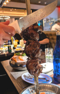 When it was time to turn our cards to the green side, Gaucho chefs immediately appeared with steak on skewers, wielding knives to cut it to each guest’s desired temperature. We started with the cordeiro (lamb), a flavorful cut in the picanha style, made famous by Brazilian steakhouses. This cut of meat comes from the top of the rump, and it is distinguished by a layer of fat that melts and flavors the meat as it grills. It was hard to surpass the lamb, and though it was the first steak that I tried, it remained my favorite throughout the meal. Next was the filet mignon and top sirloin, both grilled to allow the tender, juicy cuts of beef a slight crisp. For those who are looking to try something different, you also have the option of frango (chicken legs cooked in a peri-peri style seasoning), linguiça (Brazilian pork sausage), or medalhões com bacon (bacon-wrapped chicken).
