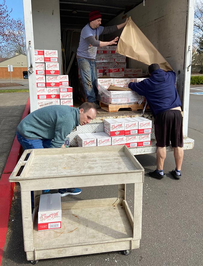 Volunteer jobs span from delivery and distribution to unloading pallets of food, packing food boxes and disinfection. Over 7000 boxes have been distributed across the 850 families from their headquarters at the Tigard High School cafeteria.