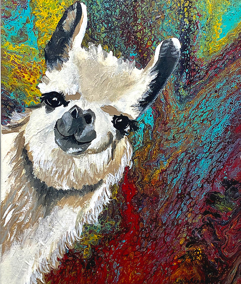 This Fall and through to January, you will find an extraordinary art show at the Tualatin Library. Come see a collection of exuberant paintings—mostly acrylic and some mixed-media pieces—by Linda Rennie, which give you an up-close-and-personal view of animals from our world and the wild! Unlike typical animal portraits you may be familiar with, these capture personalities and cool textures set against fabulous colorful backgrounds.