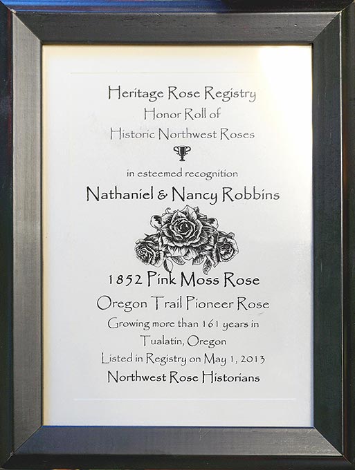 This rose has been cherished for generations. Alton Robbins, Stinger’s uncle, was the fourth-generation descendant of Nathaniel and Nancy Robbins. Before he passed away, he donated one of the roses to the Tualatin Heritage Center. This unique breed of rose now grows at Stinger’s home and in the Tualatin Historical Society’s garden. In 2013, the pink Robbins Rose was listed in the Heritage Rose Registry and recognized by the Northwest Rose Historians. For Stinger, the rose symbolizes a long family legacy.