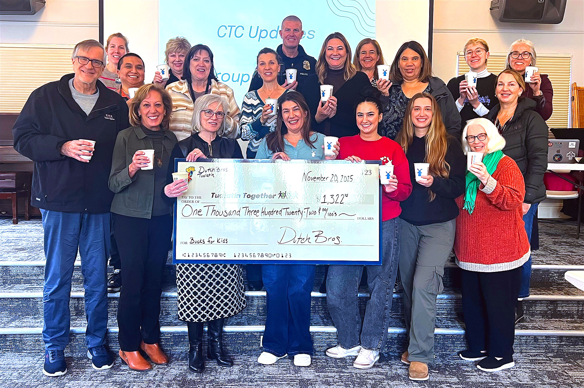 Tualatin Together would like to give special recognition to Jennifer and her team at Dutch Bros Tualatin for choosing Tualatin Together’s youth programs for their “Buck for Kids” fundraising day. Thank you for investing in our future and for providing a great place for youth to work. If you work for a company that offers corporate matching, Tualatin Together is set up on most platforms. Please reach out to us with any questions.