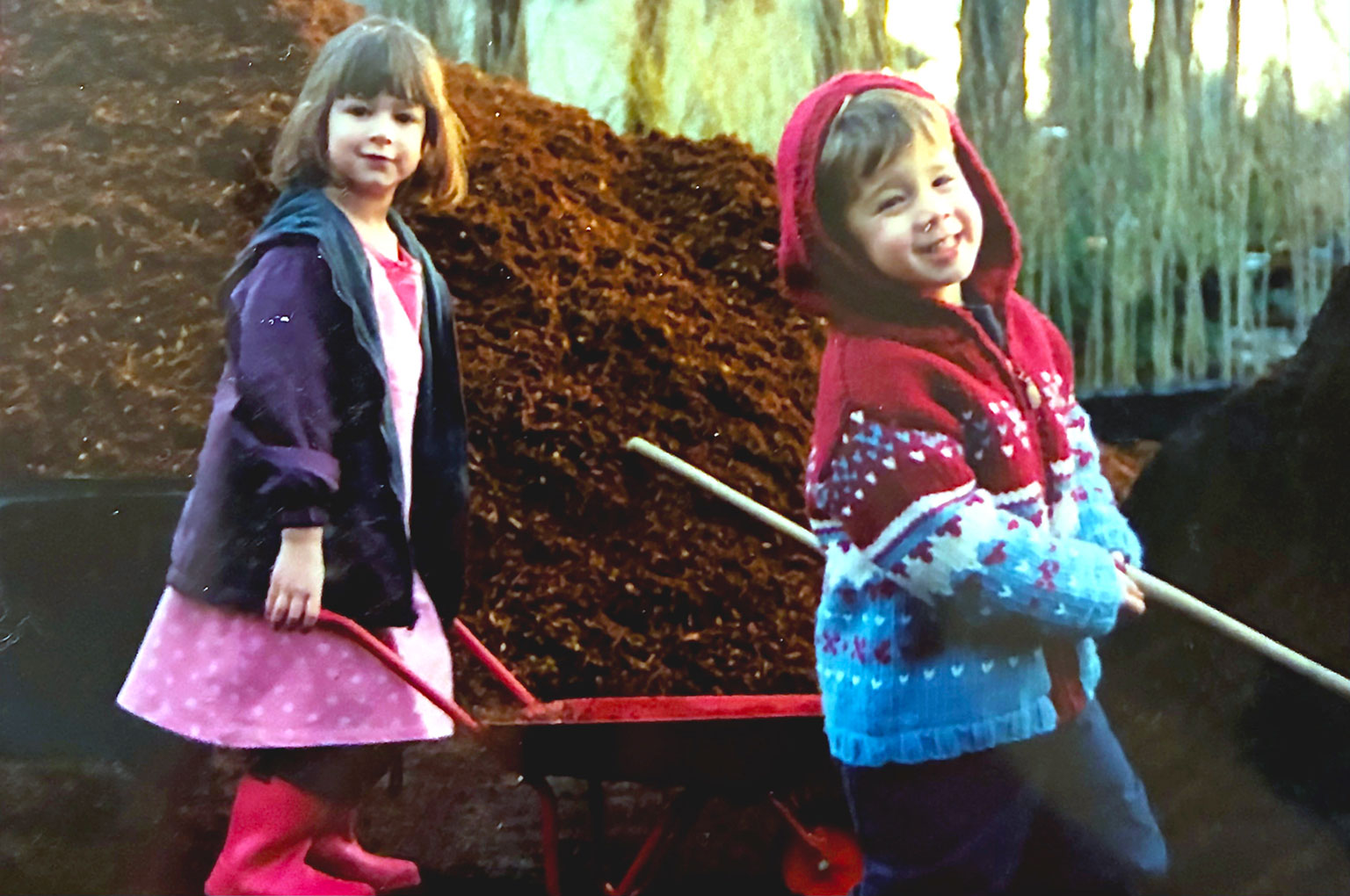 With the fall came the close of hanging basket season. Suddenly, I was out of a job! Not to worry, groundbreaking for The Garden Corner began in the winter. While the work was much more physical, I was not much of a complainer. I kept busy by helping prepare the property for The Garden Corner. I could be found outside, shoveling bark into my brother’s little wheelbarrow. Next to my father’s much larger wheelbarrow, the photographic evidence proves that clearly, we were pivotal to success.