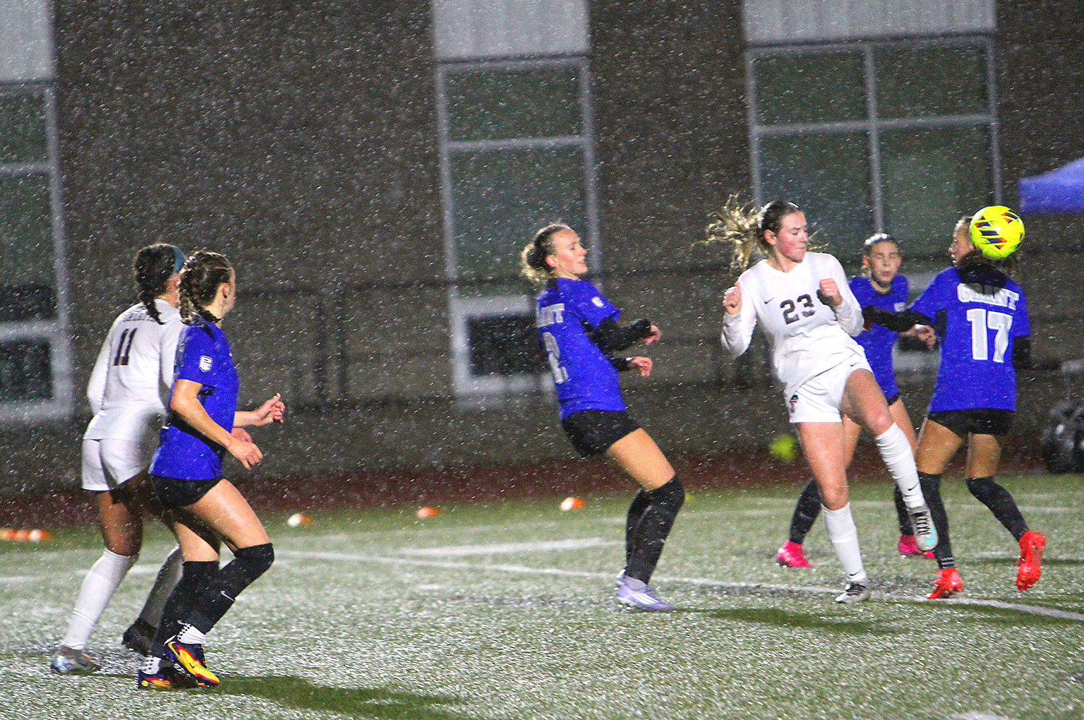 The Timberwolves hosted Roseburg in their first-round playoff game, and Roseburg jumped out to an early 1-0 lead. With about 10 seconds to go in the first half, senior Ava Elizarraraz took a corner kick and placed it right in front of the net, where sophomore Emmery McMillin headed it in to tie the game.