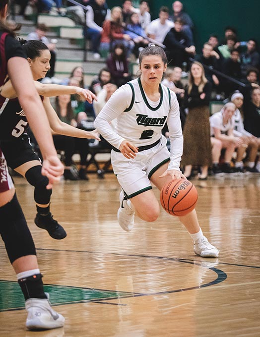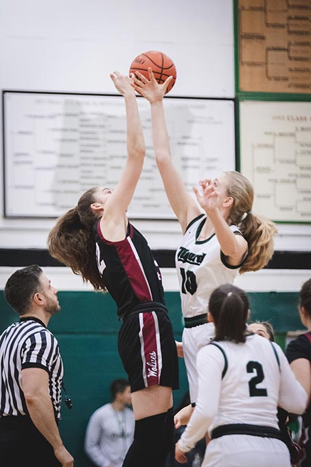 Starting the match was Tigard’s 6’3 Sarah Lamet (#10) against Tualatin’s 6’3 Natalie Lathrop (#42) for the first possession of the ball. Lathrop won out which gave the Wolves an early lead against the Tigers and a first-quarter score of 10-11 (THS-TuHS). The lead could’ve been much more, but with 0.2 seconds left in the quarter, Tigard Kennedy Brown (#2) was fouled on and was three for three in her last-second free throws.