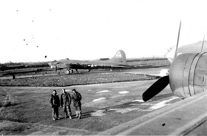 His father’s initial training was at Wendover Air Force Base in Utah. That base later was the training site of the B-29 unit that carried out the atomic bombing of Hiroshima and Nagasaki. Bradley’s aircraft crew was the first formed up for the 544th Squadron, designated Crew 41. Their squadron received the first Boeing built four engine B-17s. Among them was a plane with a serial number of 0041. That seemed to be a lucky co-incidence so his crew asked for and received that plane. Unfortunately it was not as hoped, it turned out to be a problem plane. It often had engines go out and other difficulties. Crew members gave it the nickname “ramp rat” because of the tremendous amount of time spent on the ramp for repair work. In his Memoirs, Bradley said “I think we made more three-engine landings than we did four-engine. Every time we went up something went haywire.” Those problems delayed them from flying overseas with their squadron. There was an engine change at their first stop in Nebraska. And then more difficulties at their third stop, Gander Lake, Newfoundland. At first, the weather kept them from leaving. When it cleared, as they turned on their engines, oil came pouring out of one, requiring another engine change. Finally leaving, after flying about 400 miles of the 2400 mile flight across the Atlantic to England, trouble with an engine manifold forced them to head back to land. While fixing the manifold, they flew several hundred miles before blowing out two engines, coming down near an island off the Newfoundland coast; dodging icebergs as they hit the ocean at 90 miles per hour. The crew scrambled out into two life rafts. After seven hours in frigid air, they were picked up by a Canadian J-boat. The crewmembers were so cold, they could not lift themselves out of the rafts. Their recovery was reported in the Oregonian with the headline, “10 Americans Saved from Sea.” When recovered from that ordeal, they flew across the Atlantic to England in a transport plane; reporting to war school. But Bradley said that nothing could prepare them for actual combat. On each mission, there was flack all around you as you reached the bombing site in addition to fighting off and dodging German fighter planes.