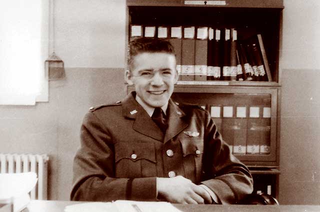 Air Force Lt Gordon Sunde in his office where plane maintenance records were kept.